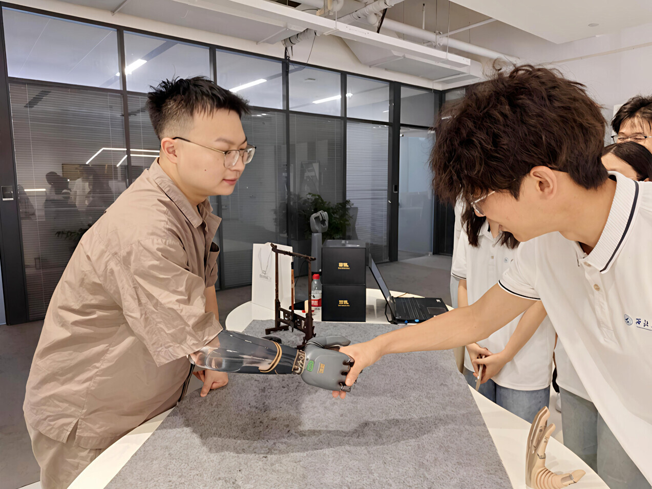 在强脑科技,队员们不仅触摸到了全球领先的脑机接口产品,更深入理解了这些技术如何切实改变残疾人及特殊群体的生活。无论是“开星果”脑机接口社交沟通训练系统帮助自闭症儿童更好地融入社会,还是一位残障工作人员现场用灵巧的机械仿生手弹奏出动人的钢琴曲,都向实践队员们生动诠释着“科技向善”的力量和温度。在随后举行的座谈会上,强脑科技周俊博士向实践队作了题为 “脑机接口技术进展与 BrainCo 的商业化实践” 的分享。