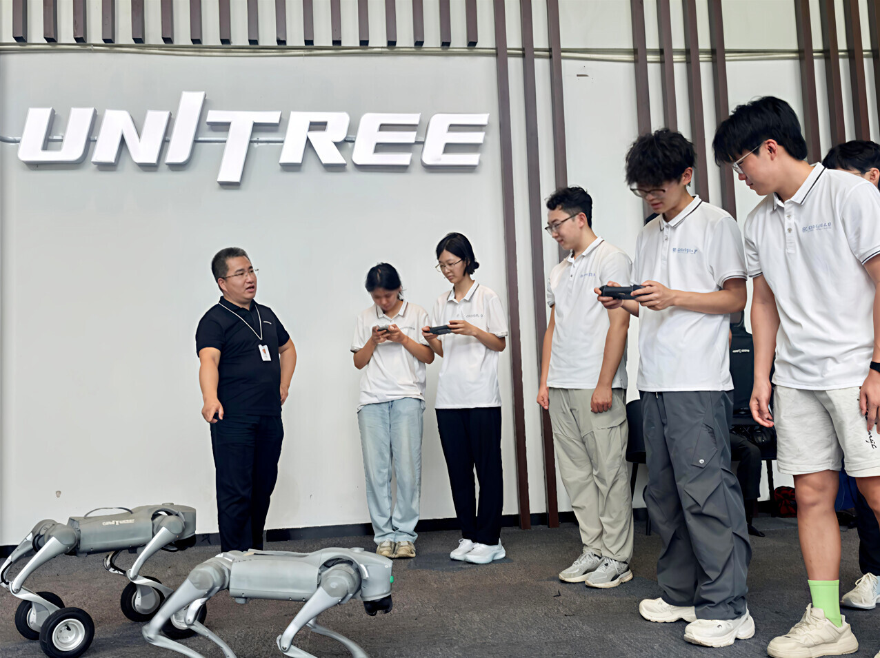 在宇树科技,校园招聘总监亢志华向实践队员系统梳理了公司产品的迭代历程。互动环节中,队员们亲自操控宇树科技的机器狗,领略前沿成果魅力。队员们还就技术细节与技术专家展开深入交流——从运动控制算法到信号传输实现,并针对网络安全专业需求,探讨了机器人技术在防护领域的应用前景。
